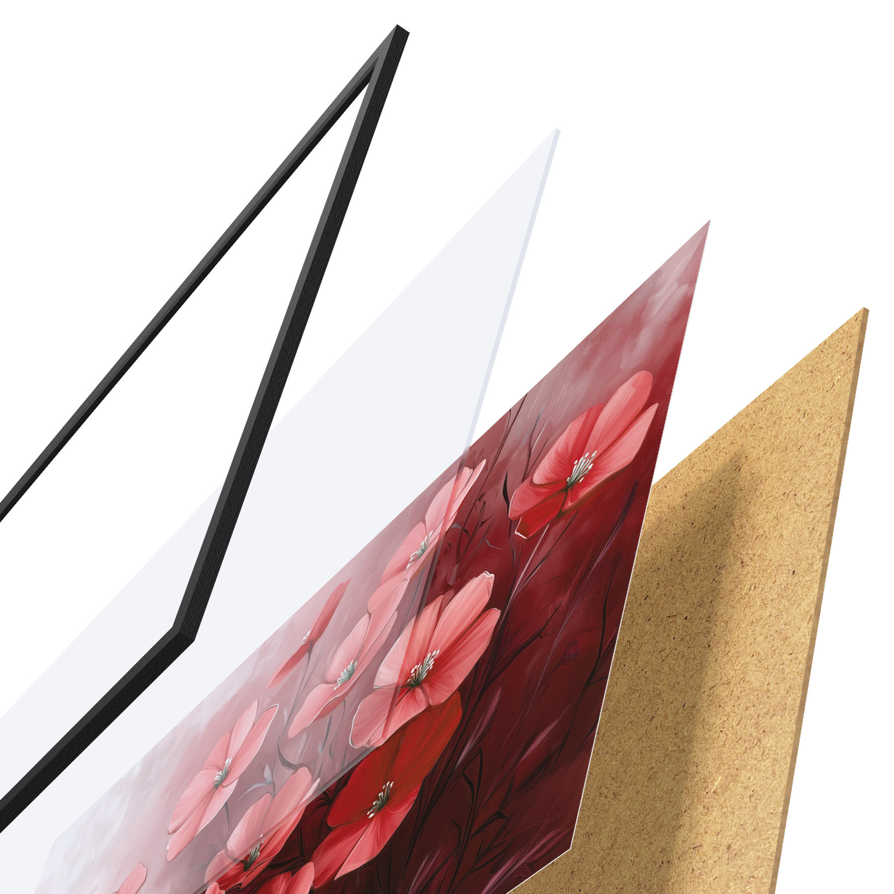 Das Poster besteht aus einem Rahmen, Plexiglas, einem gedruckten Bild und einer Rückwand aus Spanplatten. Dank der Halterungen auf der Rückseite kann das Poster sofort an die Wand gehängt werden.