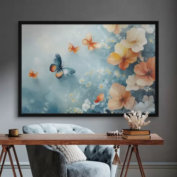 Poster Orangefarbene Blumen und Schmetterlinge f42974