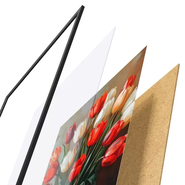 Das Poster besteht aus einem Rahmen, Plexiglas, einem gedruckten Bild und einer Rückwand aus Spanplatten. Dank der Halterungen auf der Rückseite kann das Poster sofort an die Wand gehängt werden.