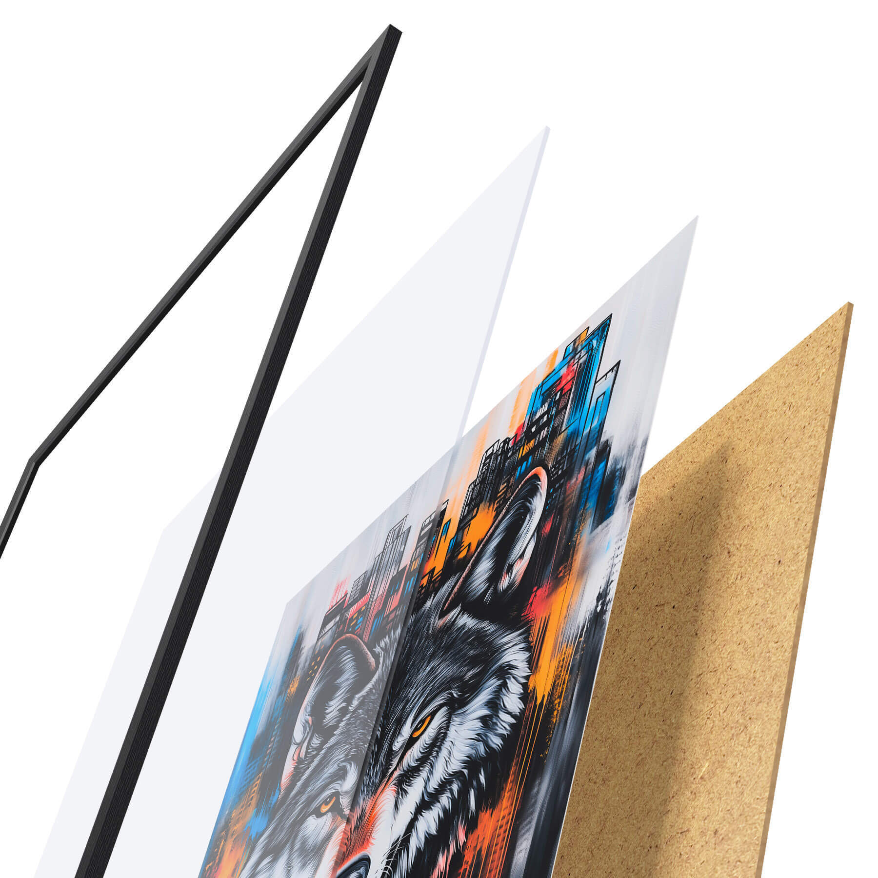 Das Poster besteht aus einem Rahmen, Plexiglas, einem gedruckten Bild und einer Rückwand aus Spanplatten. Dank der Halterungen auf der Rückseite kann das Poster sofort an die Wand gehängt werden.