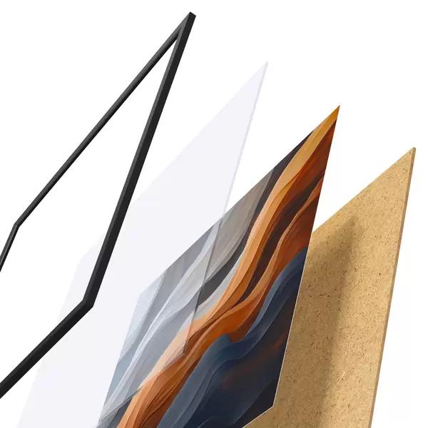 Das Poster besteht aus einem Rahmen, Plexiglas, einem gedruckten Bild und einer Rückwand aus Spanplatten. Dank der Halterungen auf der Rückseite kann das Poster sofort an die Wand gehängt werden.