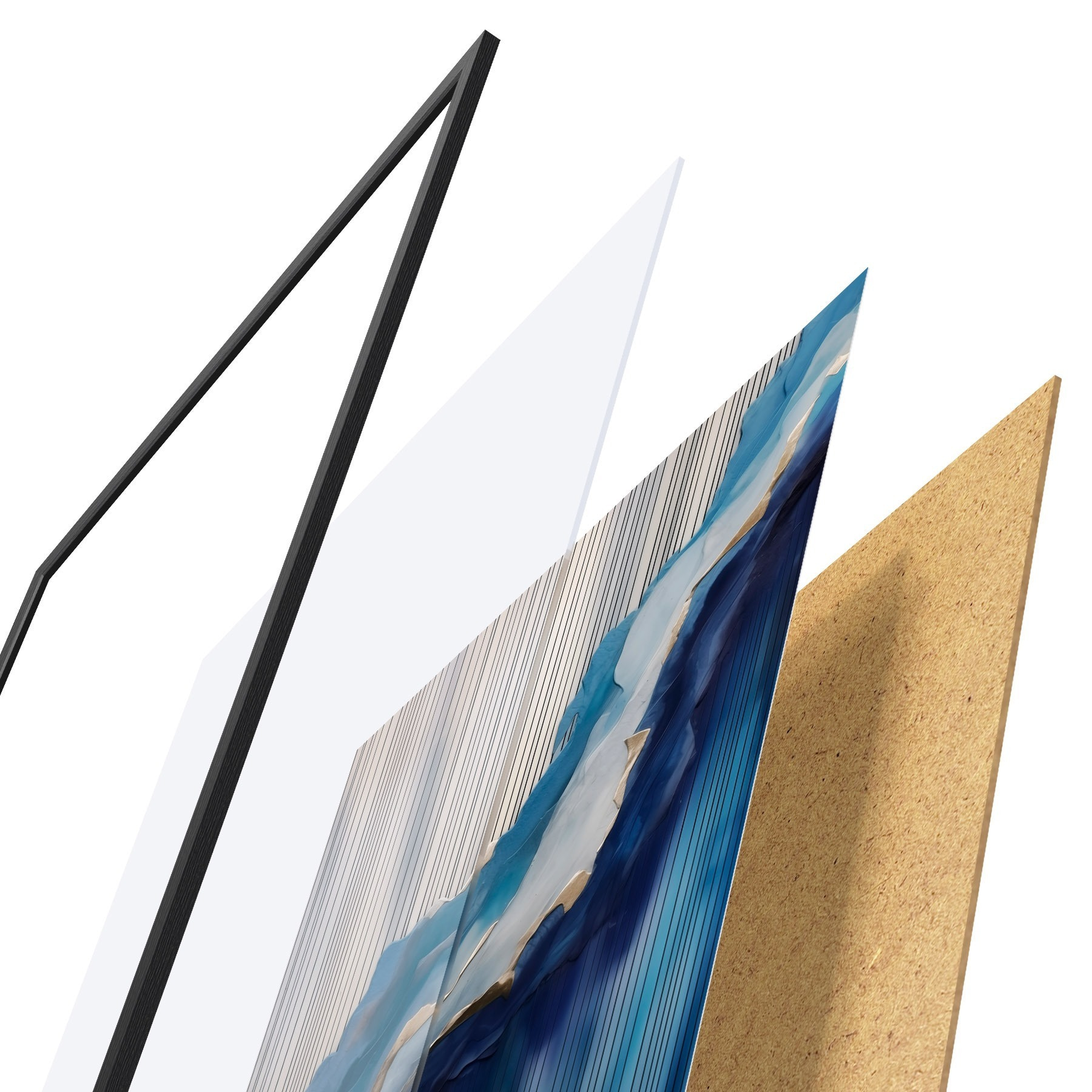 Das Poster besteht aus einem Rahmen, Plexiglas, einem gedruckten Bild und einer Rückwand aus Spanplatten. Dank der Halterungen auf der Rückseite kann das Poster sofort an die Wand gehängt werden.