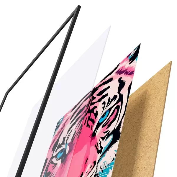 Das Poster besteht aus einem Rahmen, Plexiglas, einem gedruckten Bild und einer Rückwand aus Spanplatten. Dank der Halterungen auf der Rückseite kann das Poster sofort an die Wand gehängt werden.