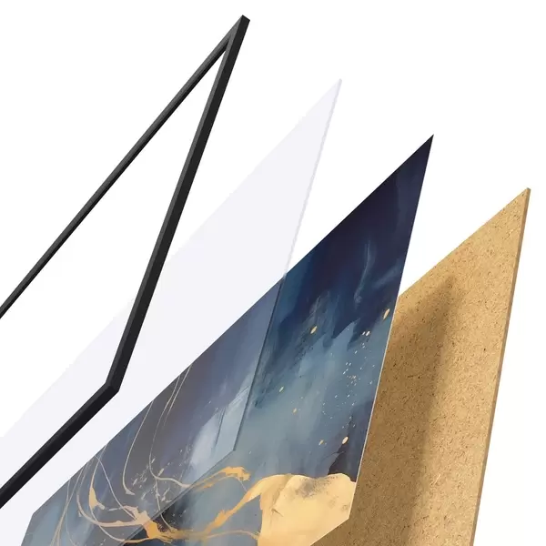 Das Poster besteht aus einem Rahmen, Plexiglas, einem gedruckten Bild und einer Rückwand aus Spanplatten. Dank der Halterungen auf der Rückseite kann das Poster sofort an die Wand gehängt werden.