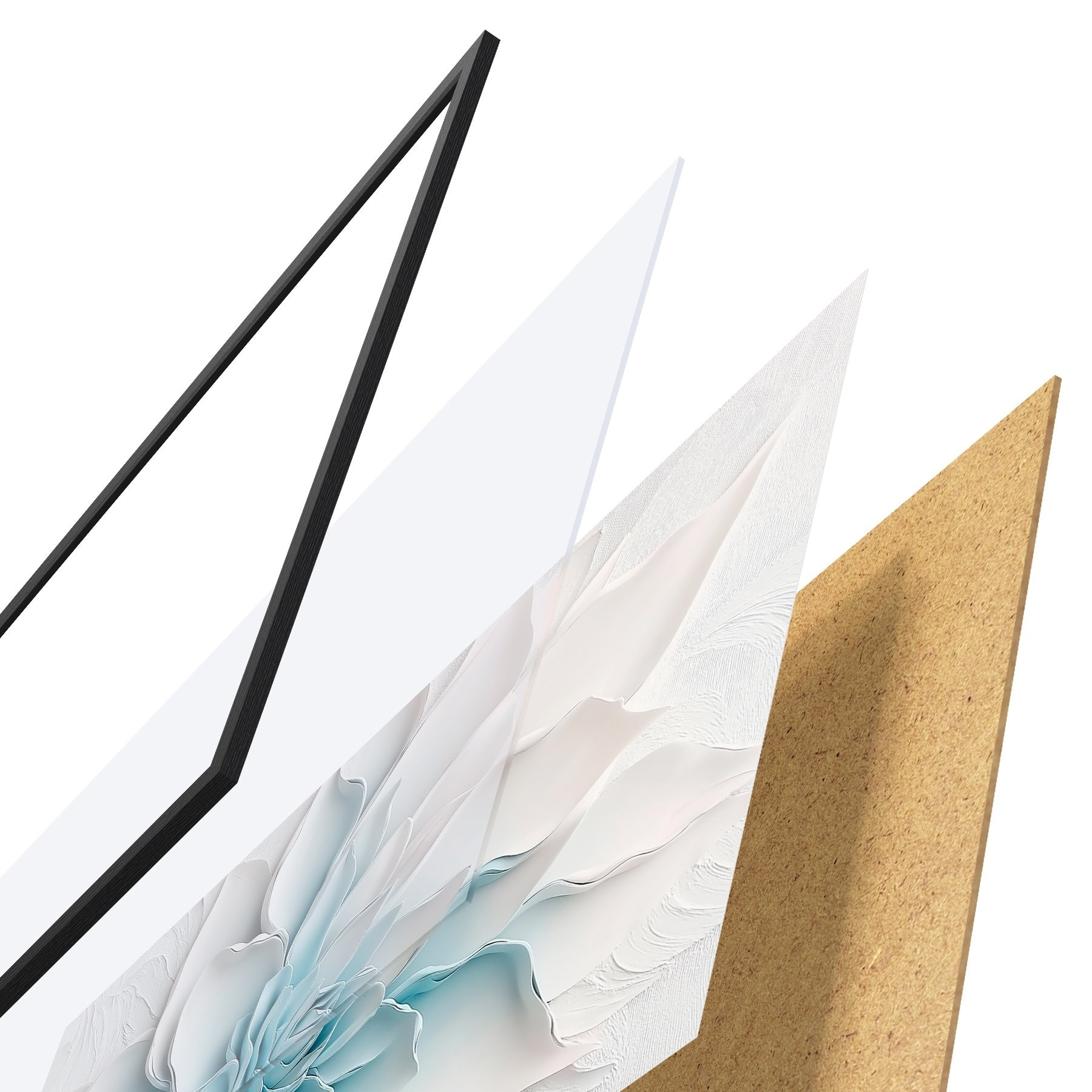 Das Poster besteht aus einem Rahmen, Plexiglas, einem gedruckten Bild und einer Rückwand aus Spanplatten. Dank der Halterungen auf der Rückseite kann das Poster sofort an die Wand gehängt werden.