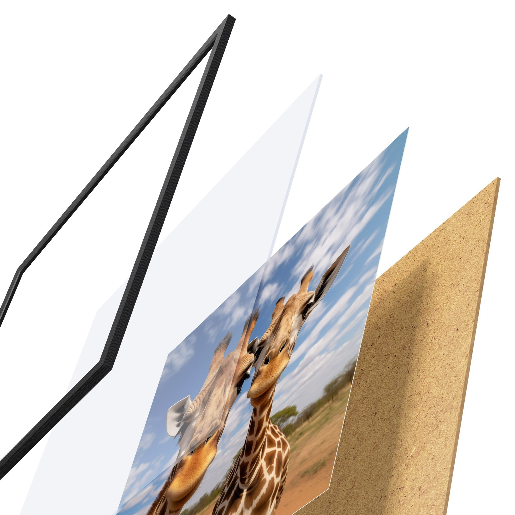 Das Poster besteht aus einem Rahmen, Plexiglas, einem gedruckten Bild und einer Rückwand aus Spanplatten. Dank der Halterungen auf der Rückseite kann das Poster sofort an die Wand gehängt werden.