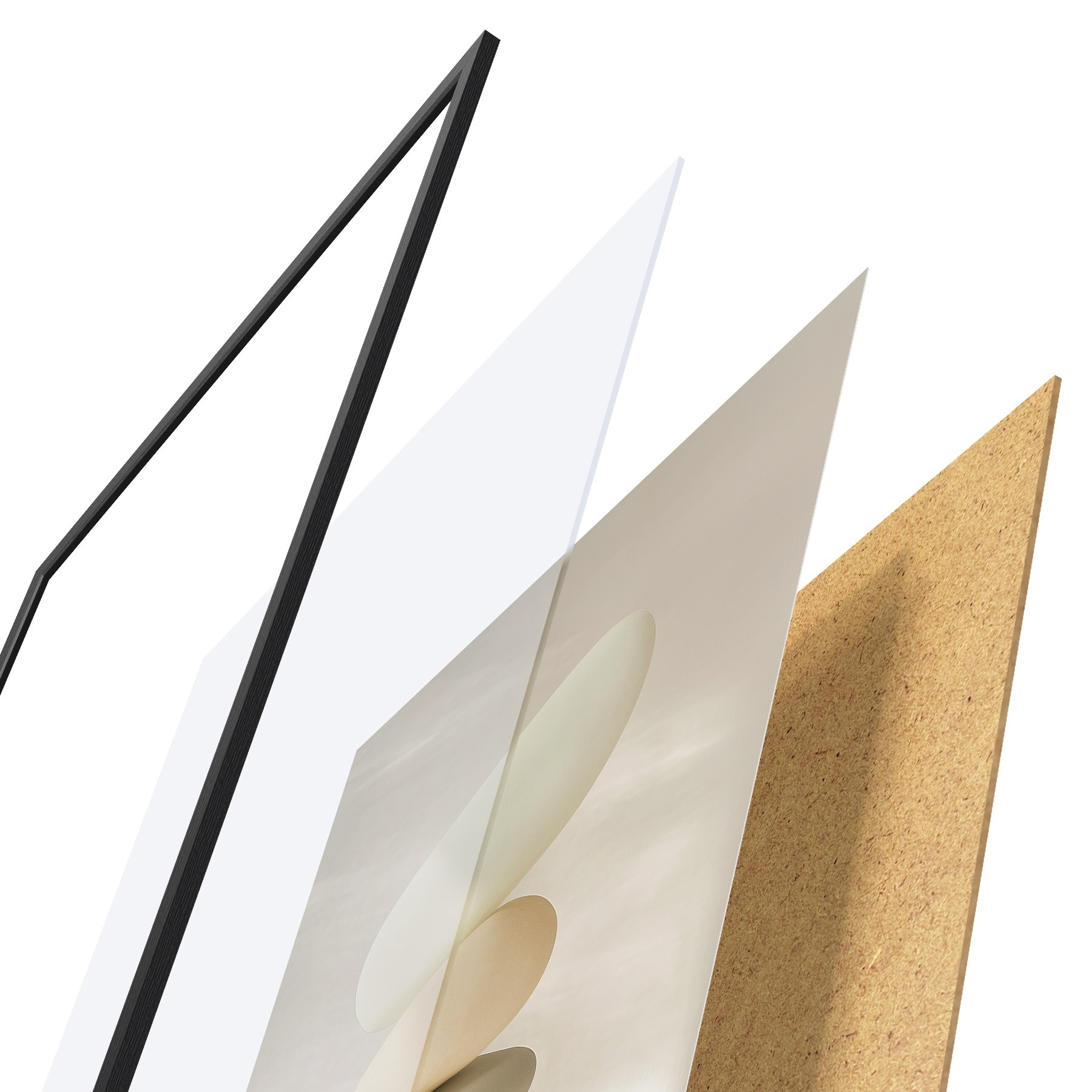 Das Poster besteht aus einem Rahmen, Plexiglas, einem gedruckten Bild und einer Rückwand aus Spanplatten. Dank der Halterungen auf der Rückseite kann das Poster sofort an die Wand gehängt werden.