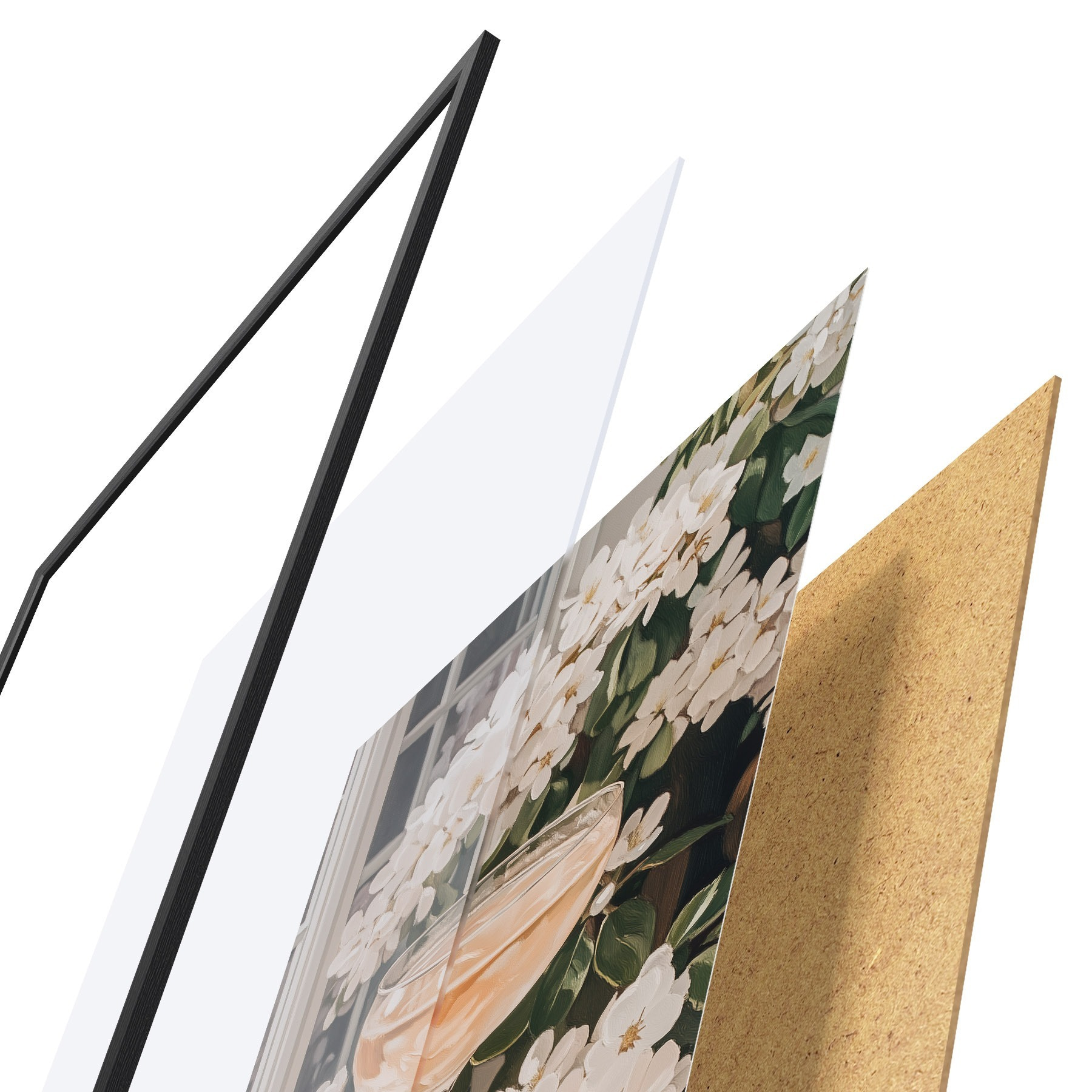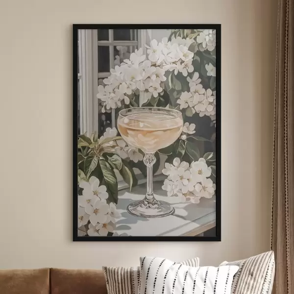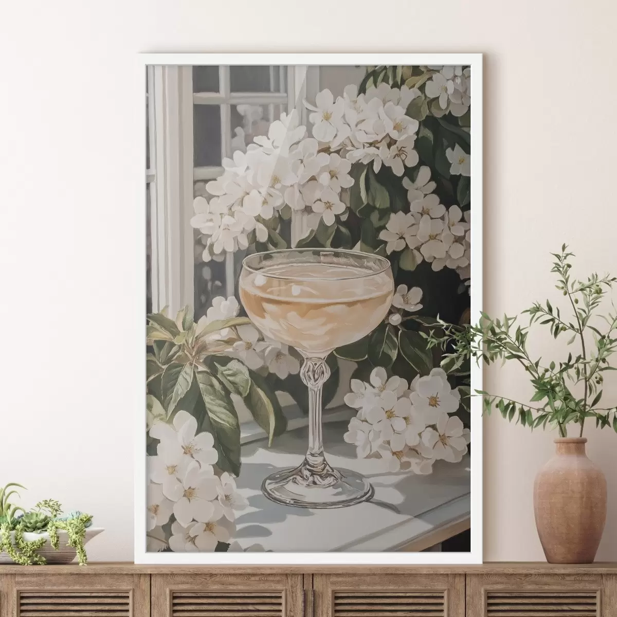 Poster Glas Champagner, Vintage, Aquarellstil, weiße Blumen Nr f43051