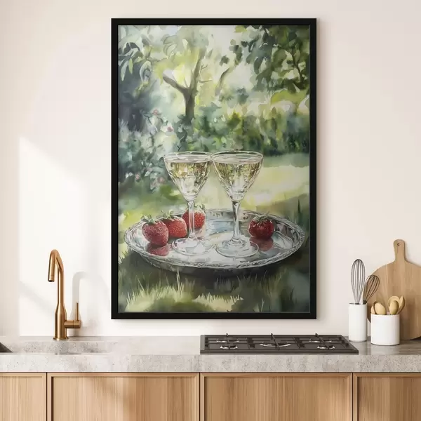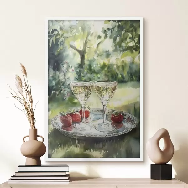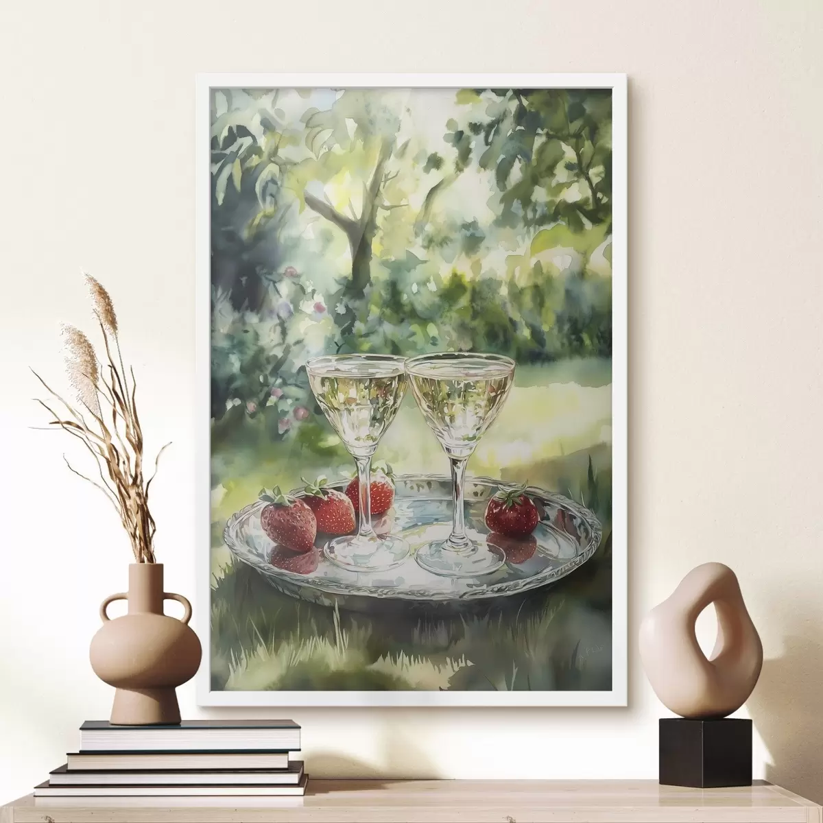 Poster Sommerpicknick mit Sekt und Erdbeeren, Aquarellstilzeichnung Nr f43055