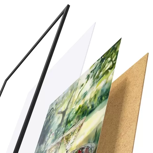 Das Poster besteht aus einem Rahmen, Plexiglas, einem gedruckten Bild und einer Rückwand aus Spanplatten. Dank der Halterungen auf der Rückseite kann das Poster sofort an die Wand gehängt werden.