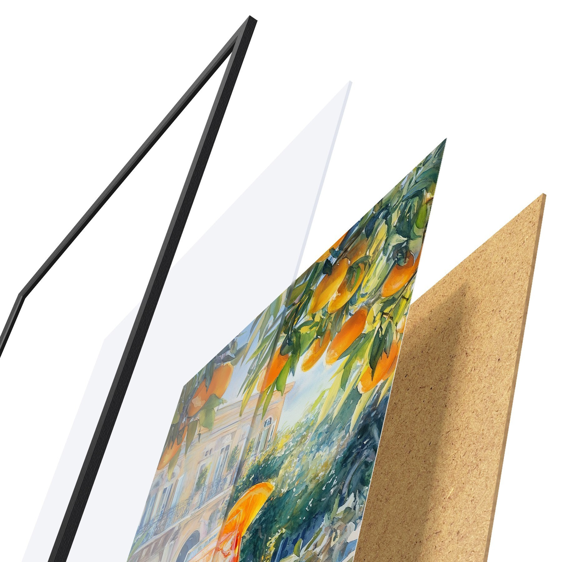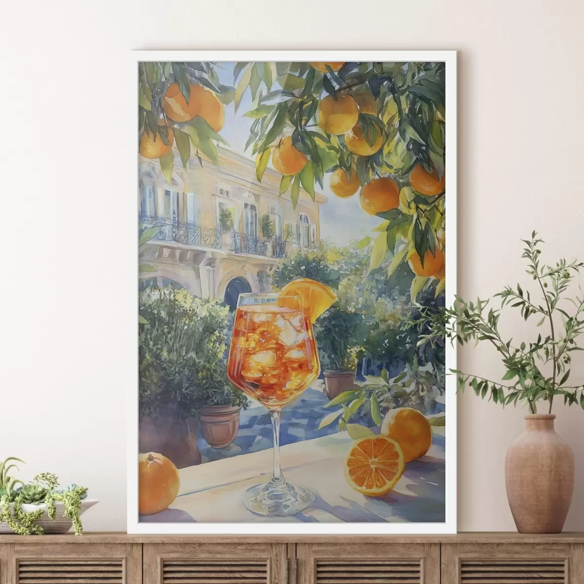 Poster Cocktail mit Orangen, Aquarellstil, Italien, Aperol Spritz, Architektur, Sommergarten f43061