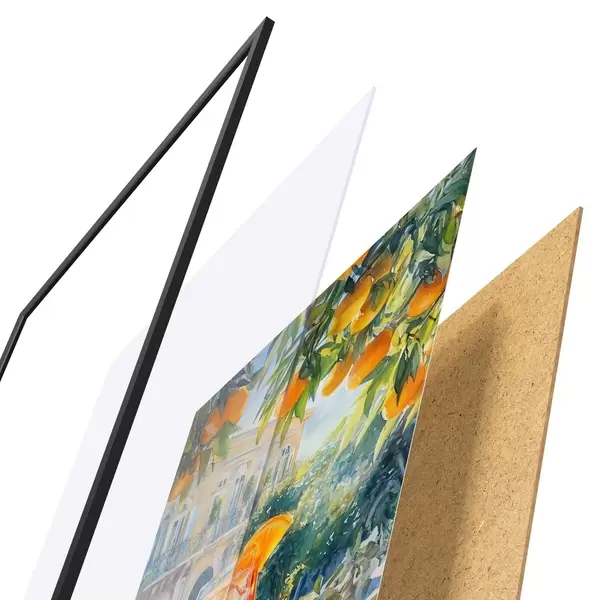 Das Poster besteht aus einem Rahmen, Plexiglas, einem gedruckten Bild und einer Rückwand aus Spanplatten. Dank der Halterungen auf der Rückseite kann das Poster sofort an die Wand gehängt werden.
