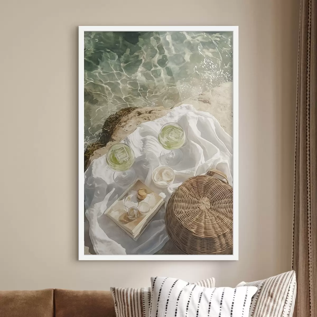 Poster Sommerästhetik, Meereswellen, Strand, Cocktails, Aquarellstil f43069
