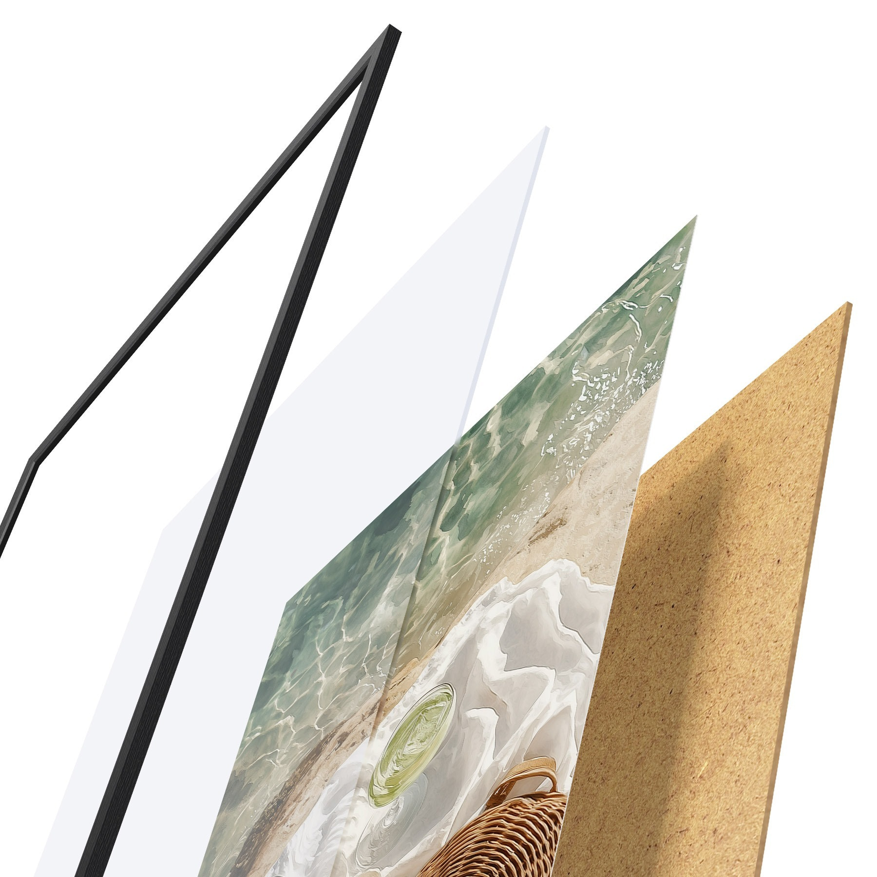 Das Poster besteht aus einem Rahmen, Plexiglas, einem gedruckten Bild und einer Rückwand aus Spanplatten. Dank der Halterungen auf der Rückseite kann das Poster sofort an die Wand gehängt werden.