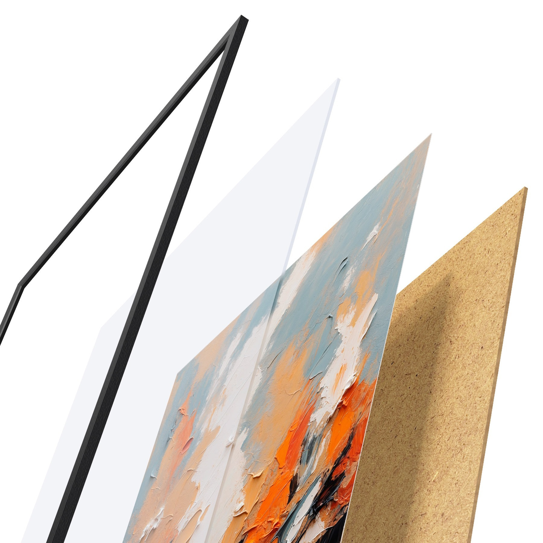 Das Poster besteht aus einem Rahmen, Plexiglas, einem gedruckten Bild und einer Rückwand aus Spanplatten. Dank der Halterungen auf der Rückseite kann das Poster sofort an die Wand gehängt werden.