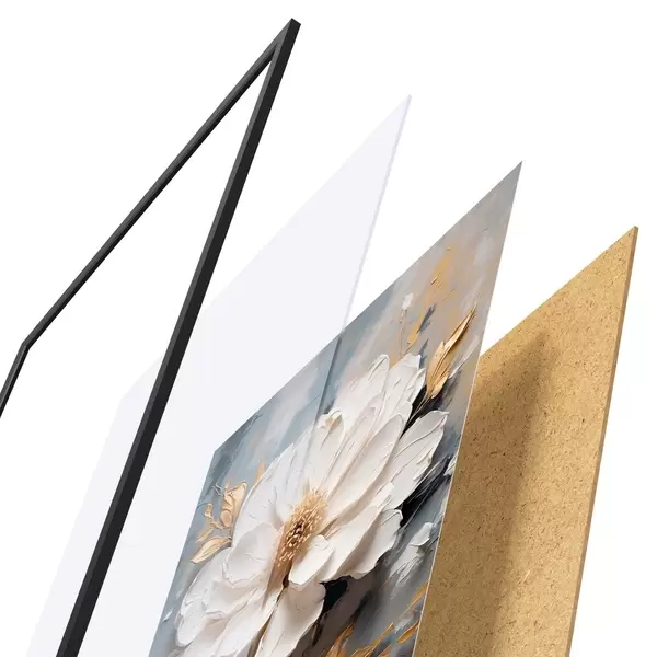 Das Poster besteht aus einem Rahmen, Plexiglas, einem gedruckten Bild und einer Rückwand aus Spanplatten. Dank der Halterungen auf der Rückseite kann das Poster sofort an die Wand gehängt werden.