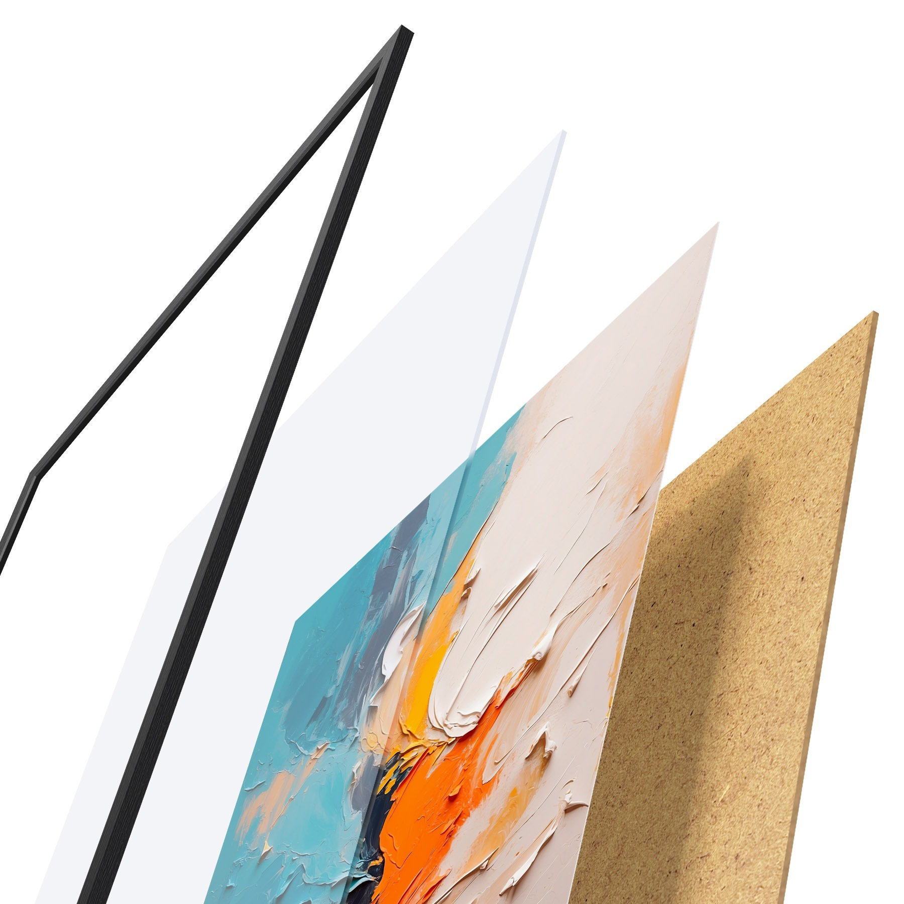 Das Poster besteht aus einem Rahmen, Plexiglas, einem gedruckten Bild und einer Rückwand aus Spanplatten. Dank der Halterungen auf der Rückseite kann das Poster sofort an die Wand gehängt werden.