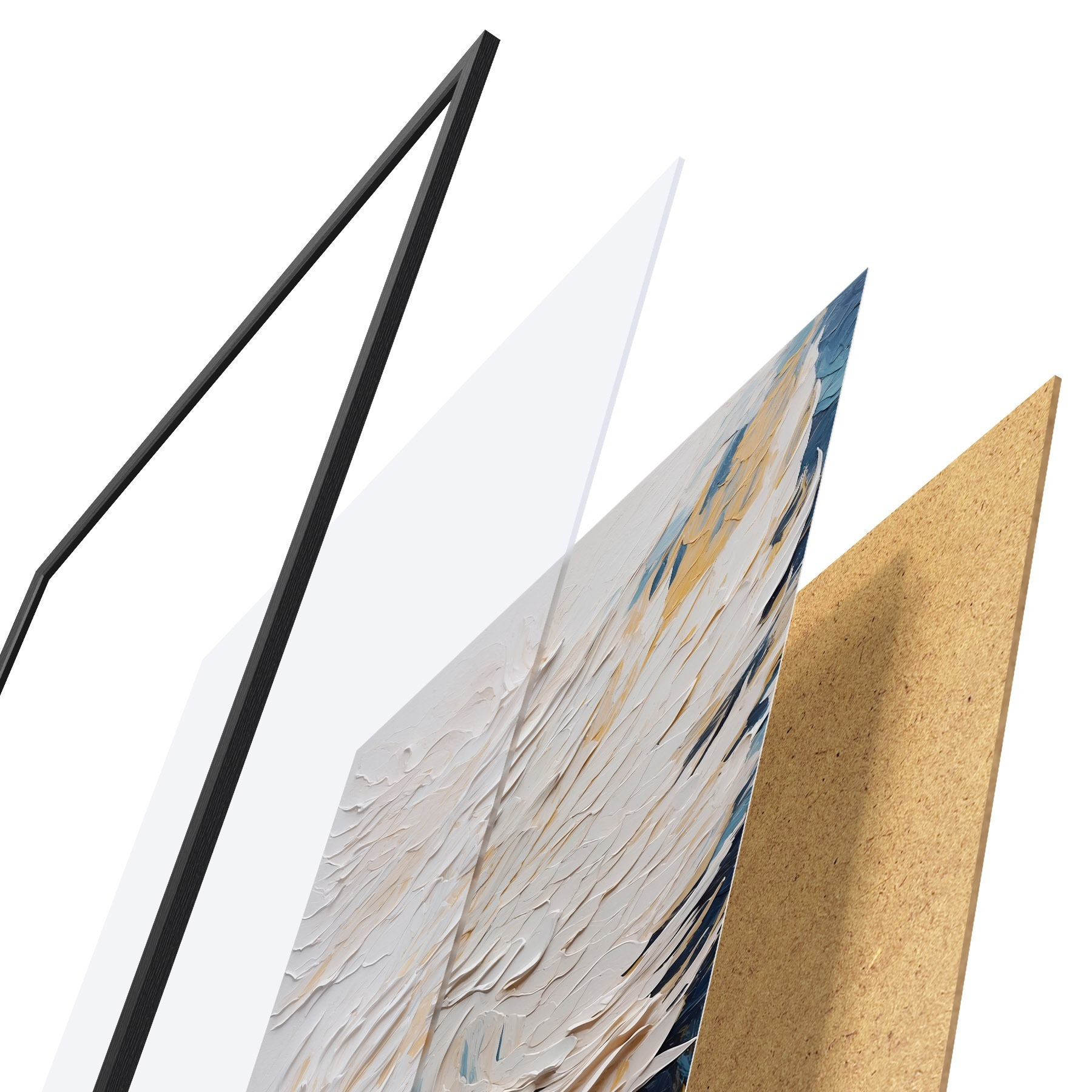 Das Poster besteht aus einem Rahmen, Plexiglas, einem gedruckten Bild und einer Rückwand aus Spanplatten. Dank der Halterungen auf der Rückseite kann das Poster sofort an die Wand gehängt werden.