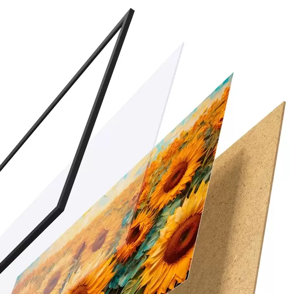 Das Poster besteht aus einem Rahmen, Plexiglas, einem gedruckten Bild und einer Rückwand aus Spanplatten. Dank der Halterungen auf der Rückseite kann das Poster sofort an die Wand gehängt werden.