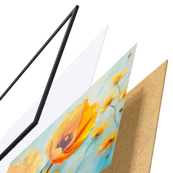 Das Poster besteht aus einem Rahmen, Plexiglas, einem gedruckten Bild und einer Rückwand aus Spanplatten. Dank der Halterungen auf der Rückseite kann das Poster sofort an die Wand gehängt werden.