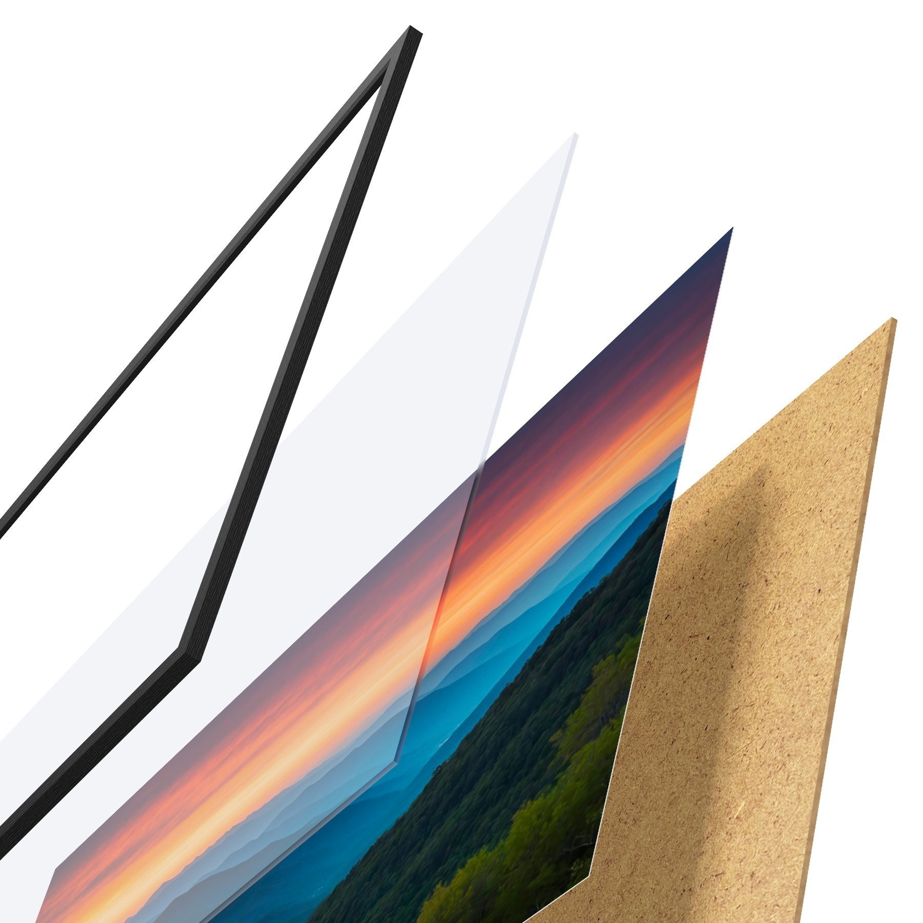 Das Poster besteht aus einem Rahmen, Plexiglas, einem gedruckten Bild und einer Rückwand aus Spanplatten. Dank der Halterungen auf der Rückseite kann das Poster sofort an die Wand gehängt werden.