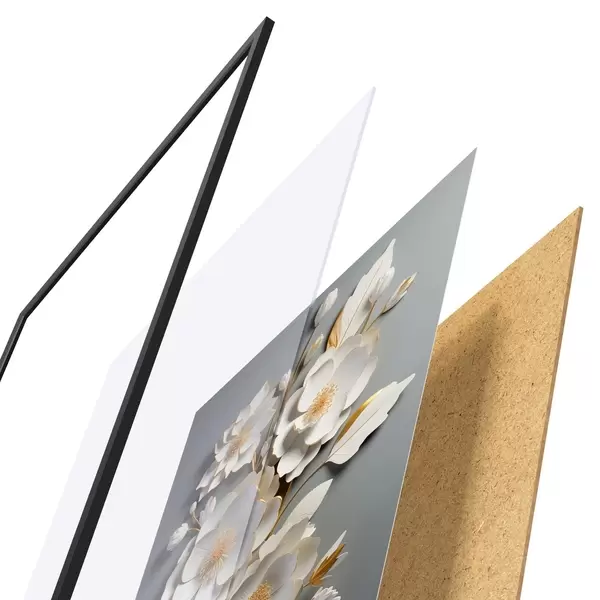 Das Poster besteht aus einem Rahmen, Plexiglas, einem gedruckten Bild und einer Rückwand aus Spanplatten. Dank der Halterungen auf der Rückseite kann das Poster sofort an die Wand gehängt werden.