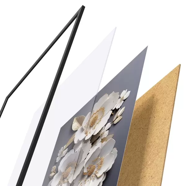 Das Poster besteht aus einem Rahmen, Plexiglas, einem gedruckten Bild und einer Rückwand aus Spanplatten. Dank der Halterungen auf der Rückseite kann das Poster sofort an die Wand gehängt werden.