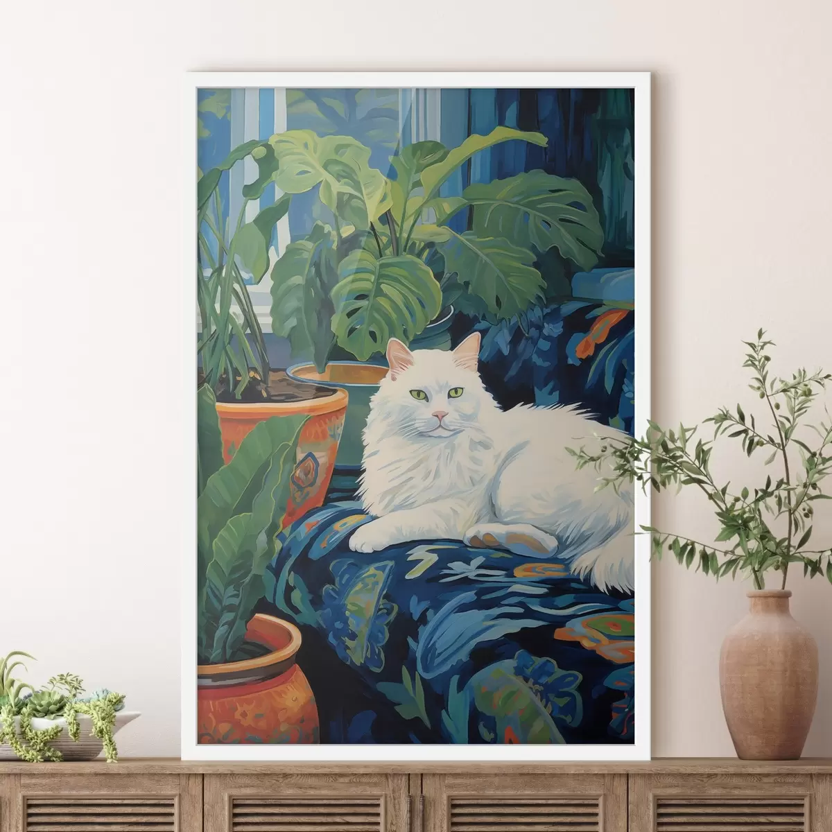Poster Eine weiße Katze inmitten von üppigem Grün und Keramikgefäßen Nr f43131