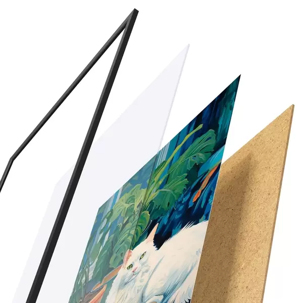 Das Poster besteht aus einem Rahmen, Plexiglas, einem gedruckten Bild und einer Rückwand aus Spanplatten. Dank der Halterungen auf der Rückseite kann das Poster sofort an die Wand gehängt werden.