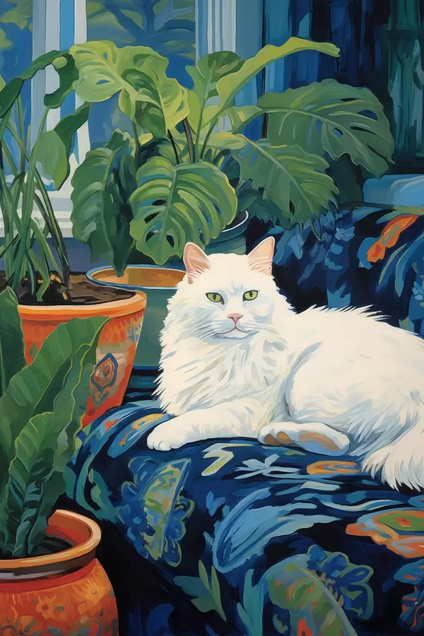 Poster Eine weiße Katze inmitten von üppigem Grün und Keramikgefäßen Nr f43131