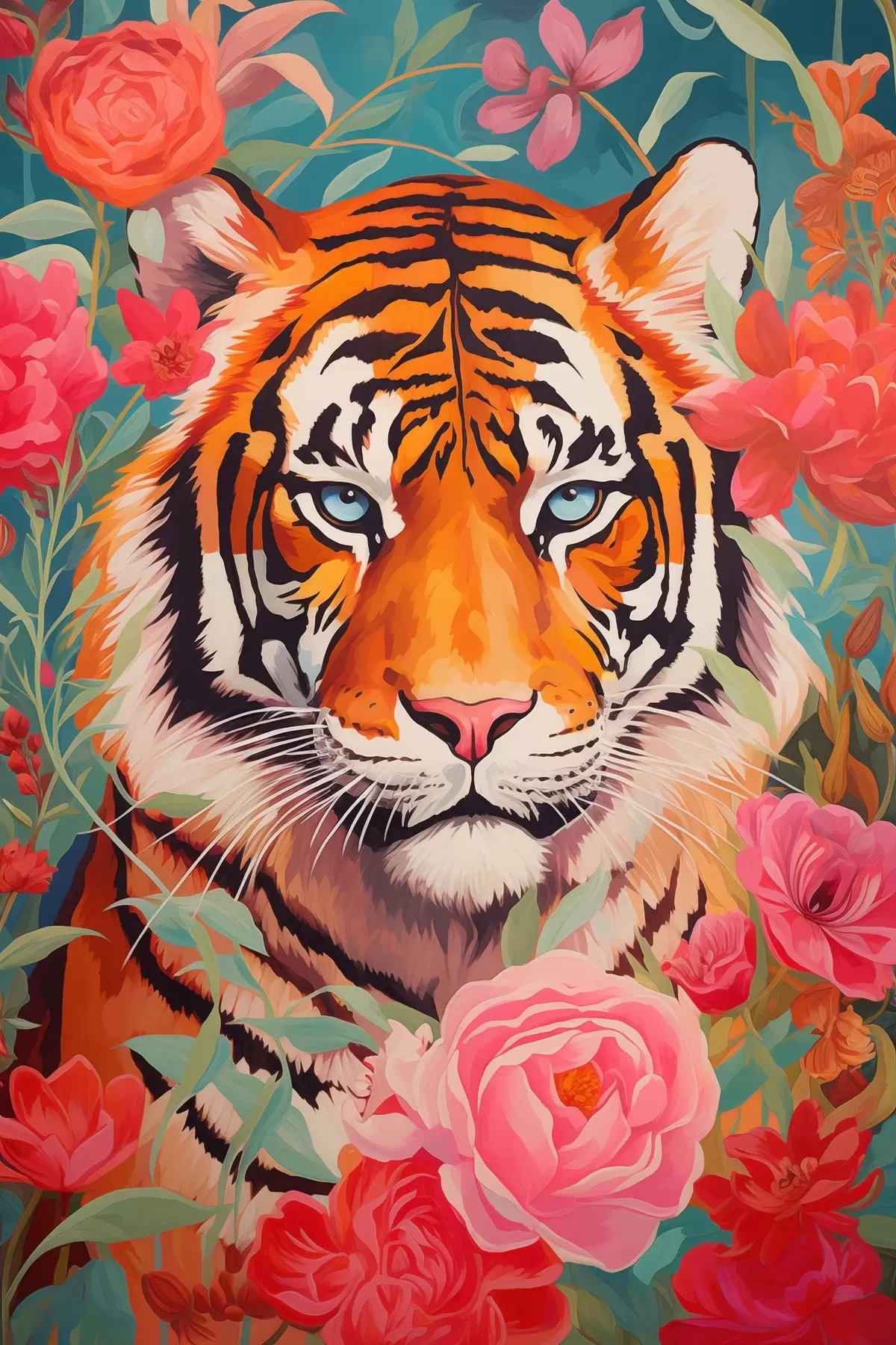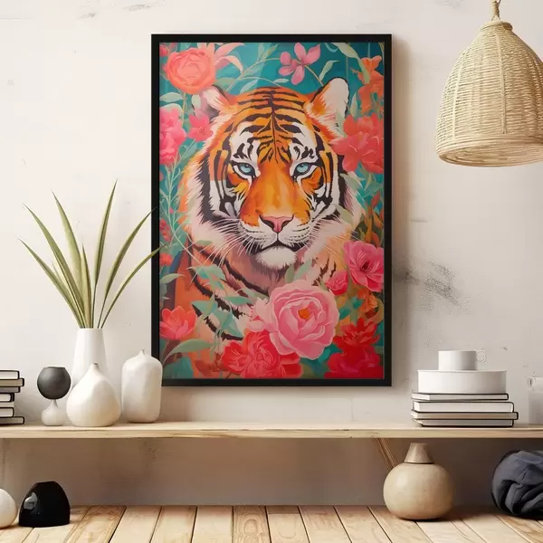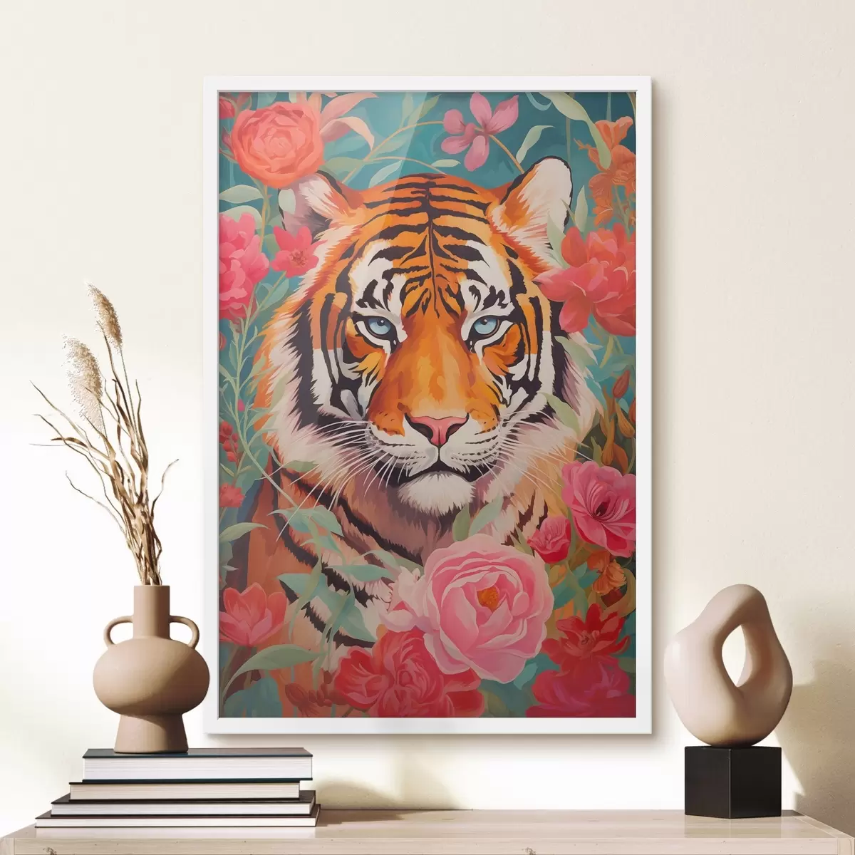 Poster Der hypnotisierende Blick eines Tigers inmitten von leuchtenden Rosen Nr f43132