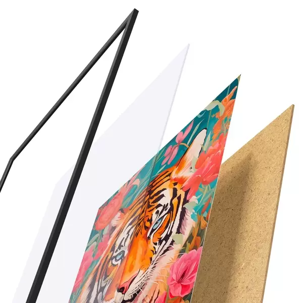 Das Poster besteht aus einem Rahmen, Plexiglas, einem gedruckten Bild und einer Rückwand aus Spanplatten. Dank der Halterungen auf der Rückseite kann das Poster sofort an die Wand gehängt werden.
