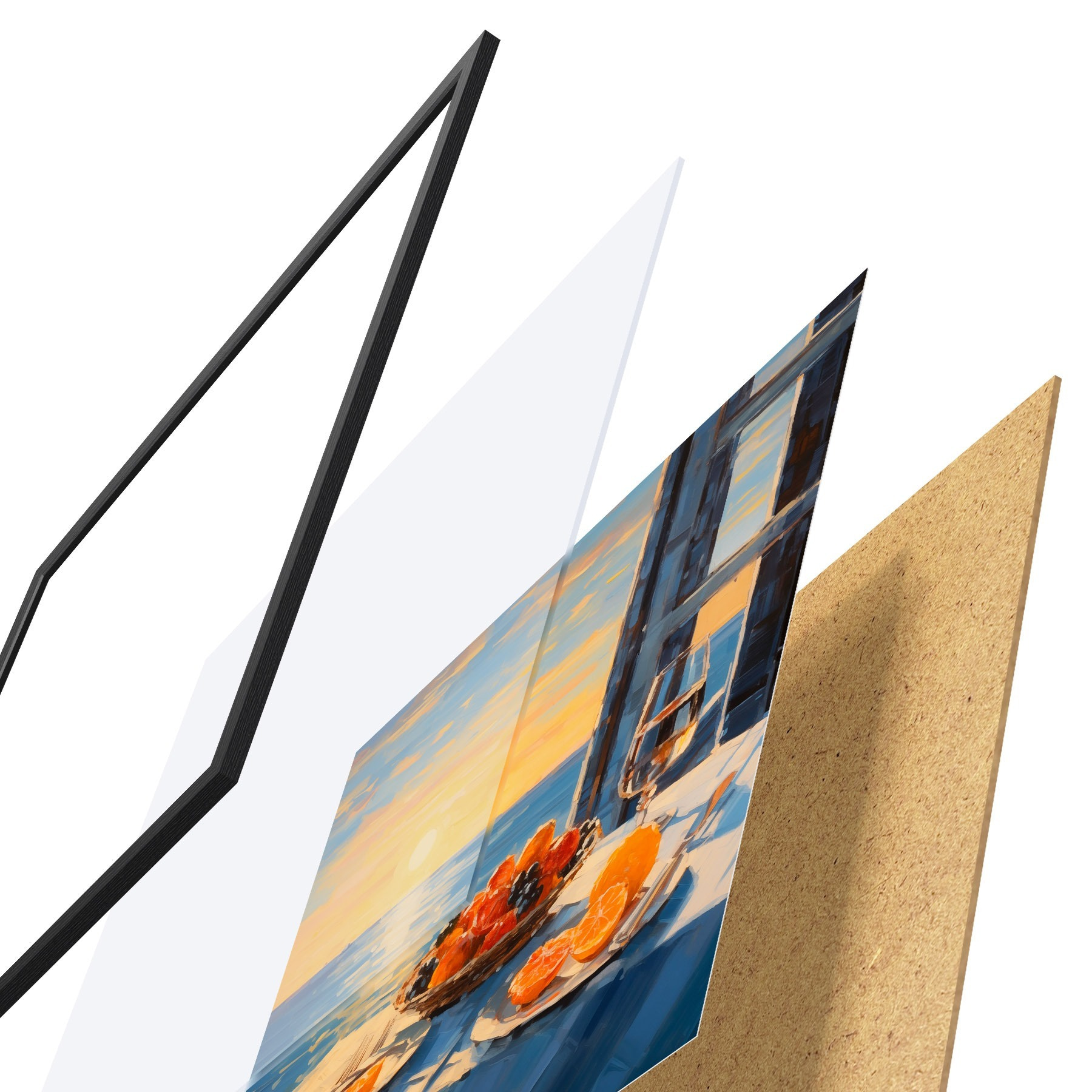 Das Poster besteht aus einem Rahmen, Plexiglas, einem gedruckten Bild und einer Rückwand aus Spanplatten. Dank der Halterungen auf der Rückseite kann das Poster sofort an die Wand gehängt werden.