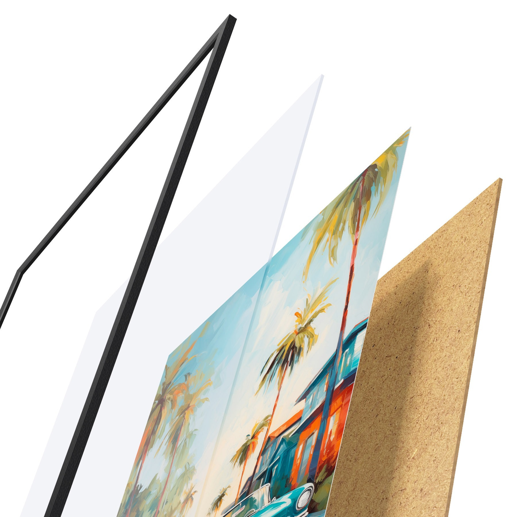Das Poster besteht aus einem Rahmen, Plexiglas, einem gedruckten Bild und einer Rückwand aus Spanplatten. Dank der Halterungen auf der Rückseite kann das Poster sofort an die Wand gehängt werden.