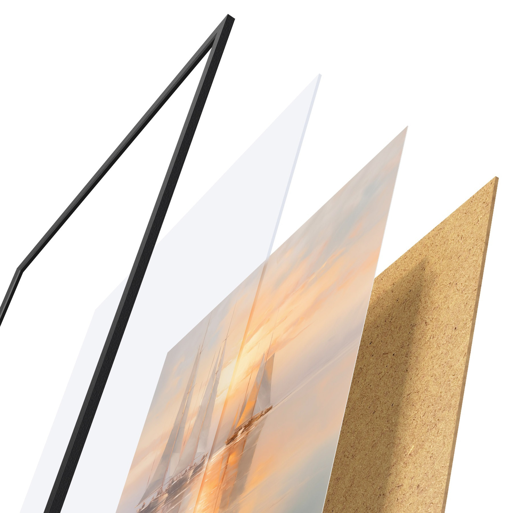 Das Poster besteht aus einem Rahmen, Plexiglas, einem gedruckten Bild und einer Rückwand aus Spanplatten. Dank der Halterungen auf der Rückseite kann das Poster sofort an die Wand gehängt werden.