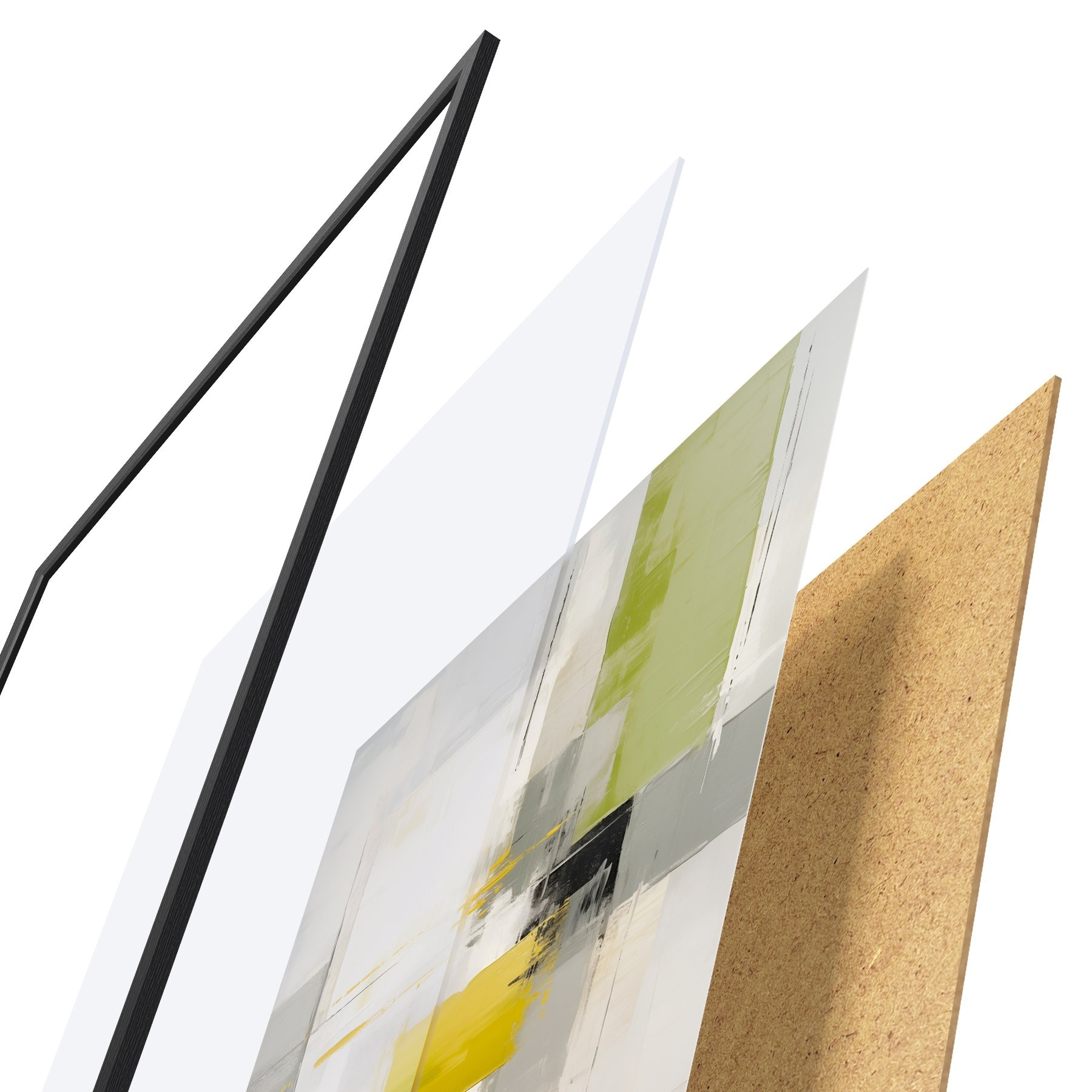 Das Poster besteht aus einem Rahmen, Plexiglas, einem gedruckten Bild und einer Rückwand aus Spanplatten. Dank der Halterungen auf der Rückseite kann das Poster sofort an die Wand gehängt werden.