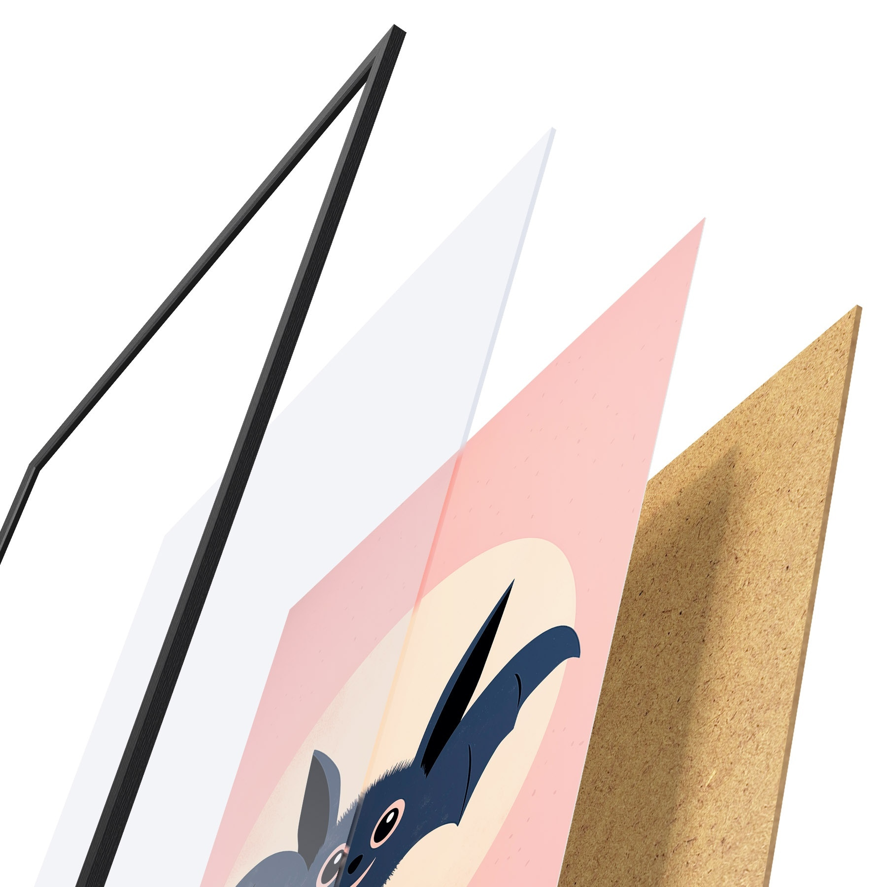 Das Poster besteht aus einem Rahmen, Plexiglas, einem gedruckten Bild und einer Rückwand aus Spanplatten. Dank der Halterungen auf der Rückseite kann das Poster sofort an die Wand gehängt werden.