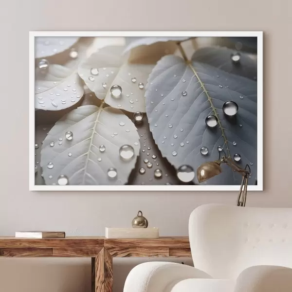 Poster Nahaufnahme von weißen Blättern, die mit Wassertropfen bedeckt sind, eine minimalistische Komposition, neutraler Hintergrund f43159