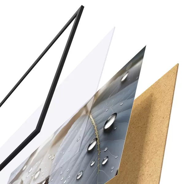 Das Poster besteht aus einem Rahmen, Plexiglas, einem gedruckten Bild und einer Rückwand aus Spanplatten. Dank der Halterungen auf der Rückseite kann das Poster sofort an die Wand gehängt werden.