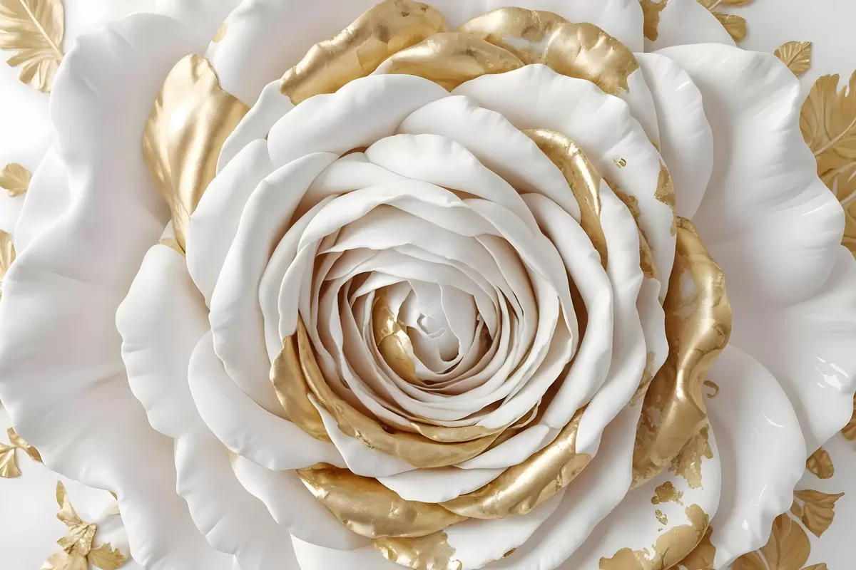 Poster Eine weiße minimalistische dekorative Rose mit gelben Akzenten, die Blütenblätter sind geschichtet und gekräuselt f43160