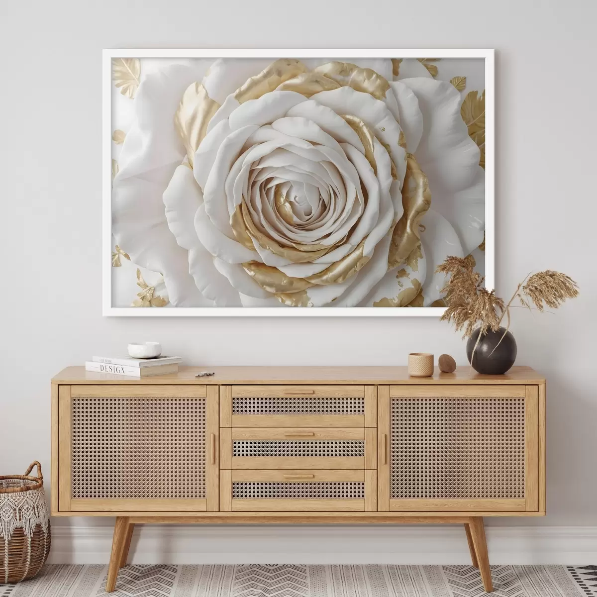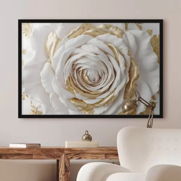 Poster Eine weiße minimalistische dekorative Rose mit gelben Akzenten, die Blütenblätter sind geschichtet und gekräuselt Nr f43160
