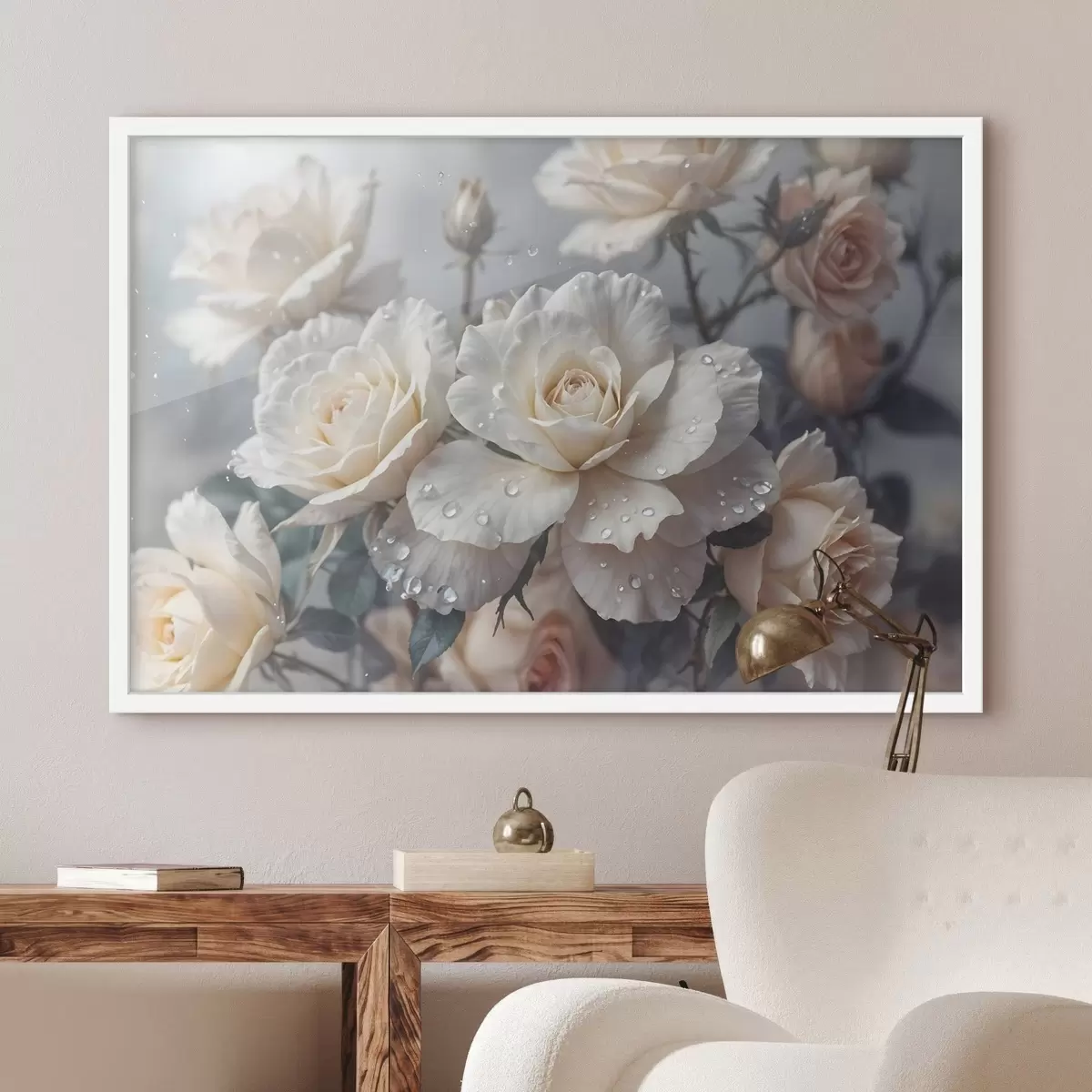 Poster Eine Gruppe von weißen Rosen mit Wassertropfen auf den Blütenblättern, einige grüne Blätter, gedämpfter Hintergrund, weiches Licht f43163