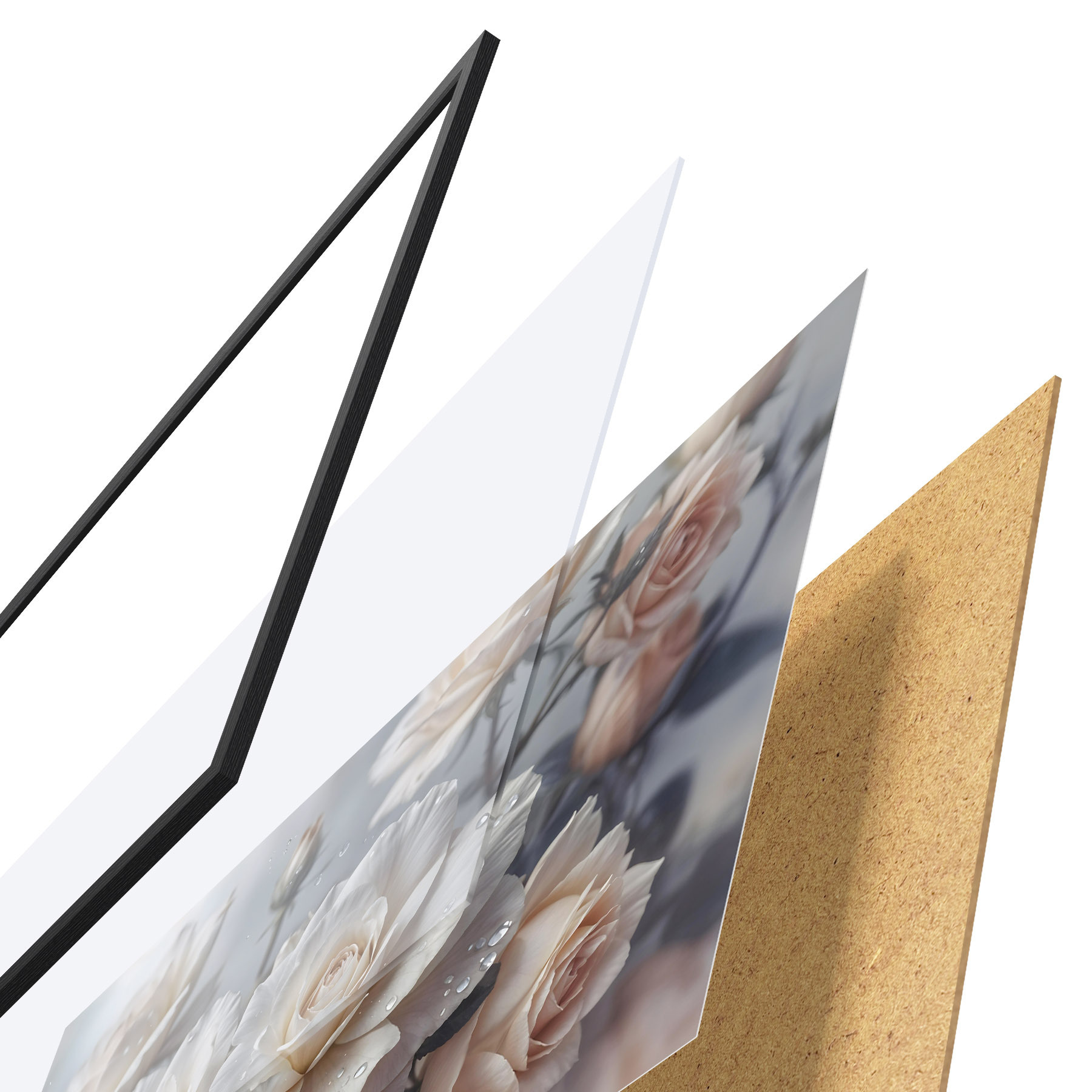 Das Poster besteht aus einem Rahmen, Plexiglas, einem gedruckten Bild und einer Rückwand aus Spanplatten. Dank der Halterungen auf der Rückseite kann das Poster sofort an die Wand gehängt werden.