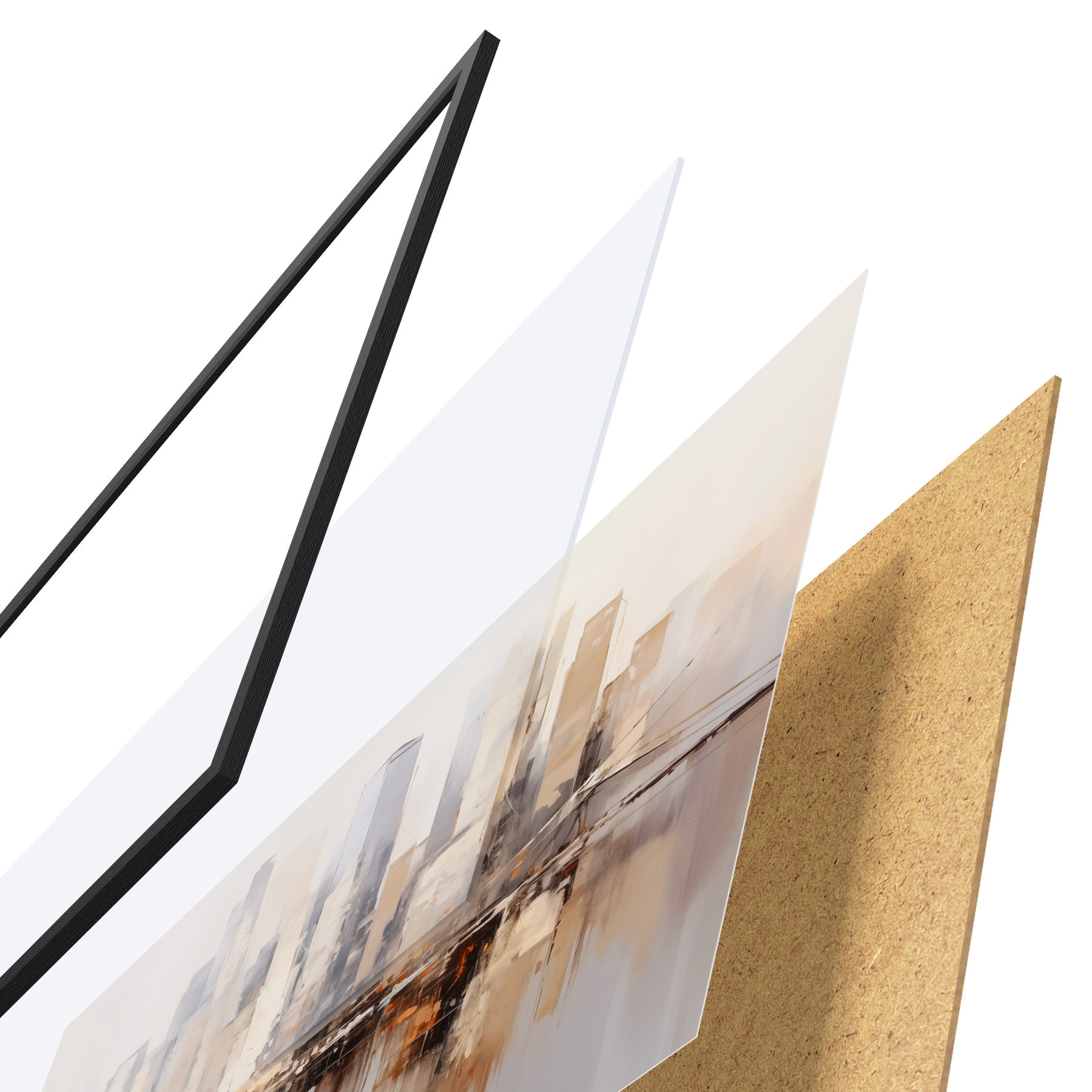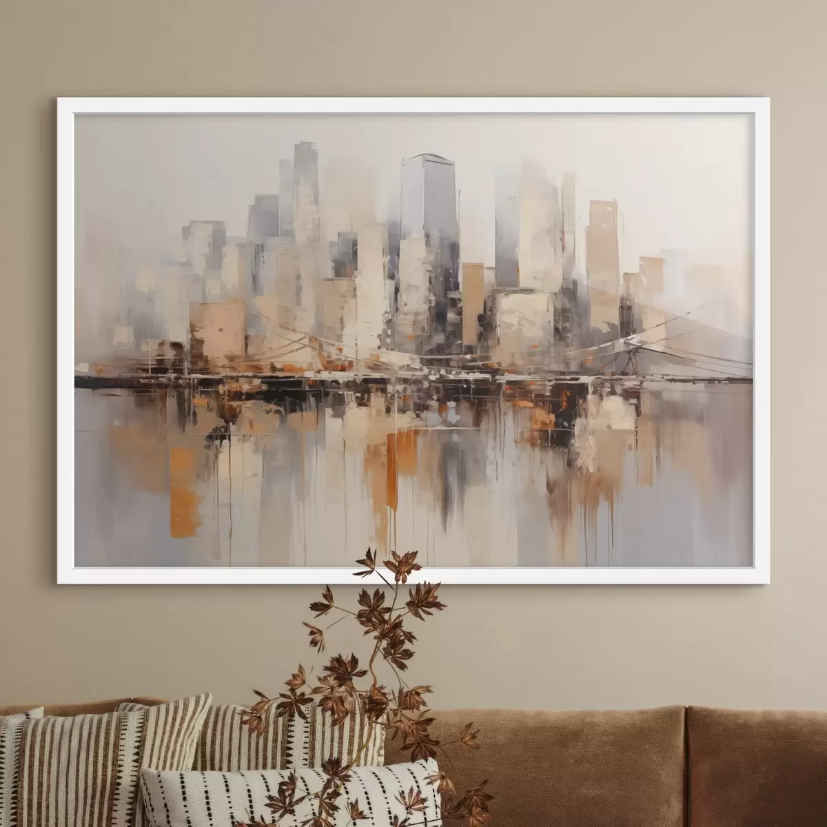 Poster Abstraktes Gemälde einer Stadtlandschaft mit hohen Gebäuden in Braun-, Grau- und Weißtönen, die sich im Wasser spiegeln f43168