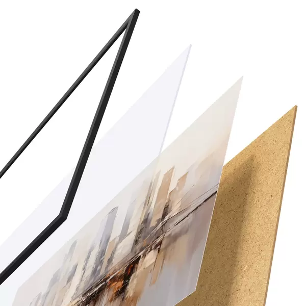 Das Poster besteht aus einem Rahmen, Plexiglas, einem gedruckten Bild und einer Rückwand aus Spanplatten. Dank der Halterungen auf der Rückseite kann das Poster sofort an die Wand gehängt werden.