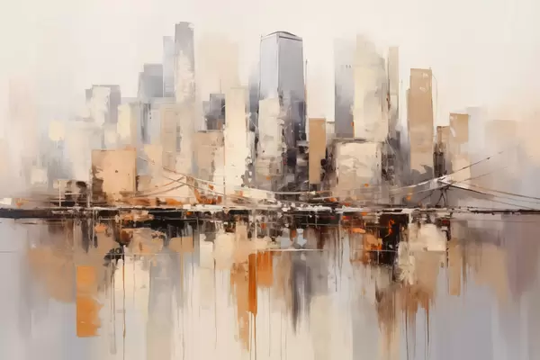 Poster Abstraktes Gemälde einer Stadtlandschaft mit hohen Gebäuden in Braun-, Grau- und Weißtönen, die sich im Wasser spiegeln Nr f43168