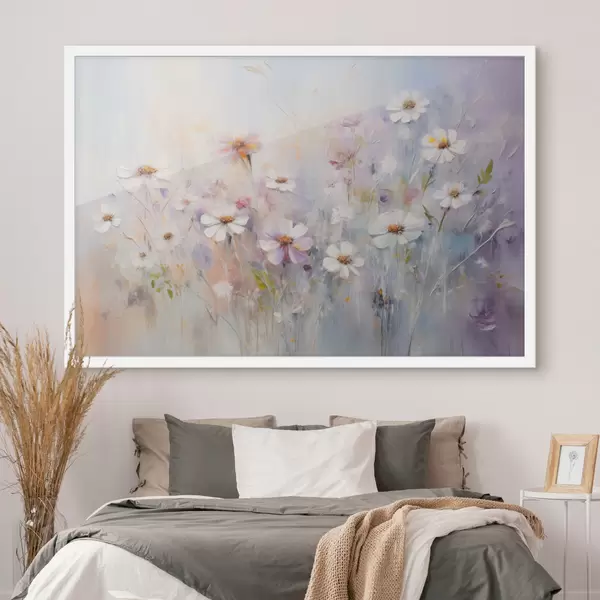 Poster Abstraktes, strukturiertes Feld mit weißen und rosa Blumen, weiche Pastellfarben, zarte Pinselstriche, Blumenwiese f43170