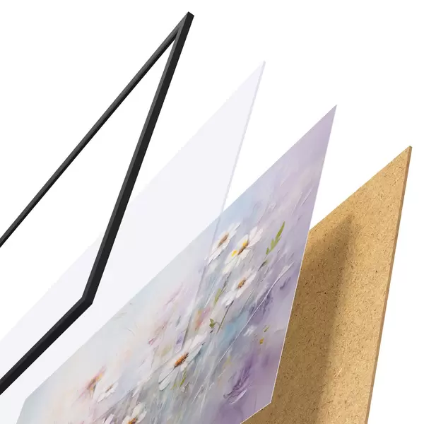 Das Poster besteht aus einem Rahmen, Plexiglas, einem gedruckten Bild und einer Rückwand aus Spanplatten. Dank der Halterungen auf der Rückseite kann das Poster sofort an die Wand gehängt werden.