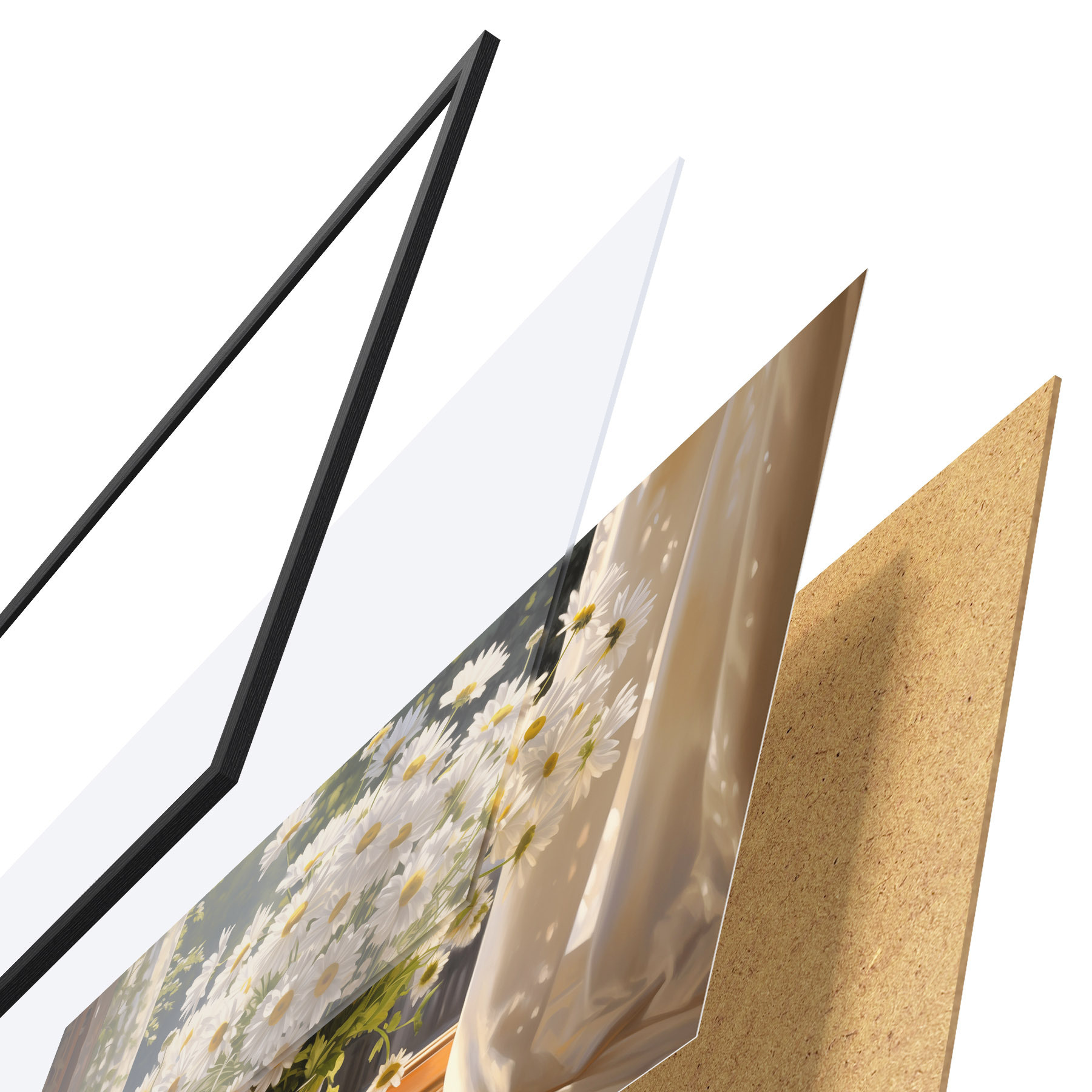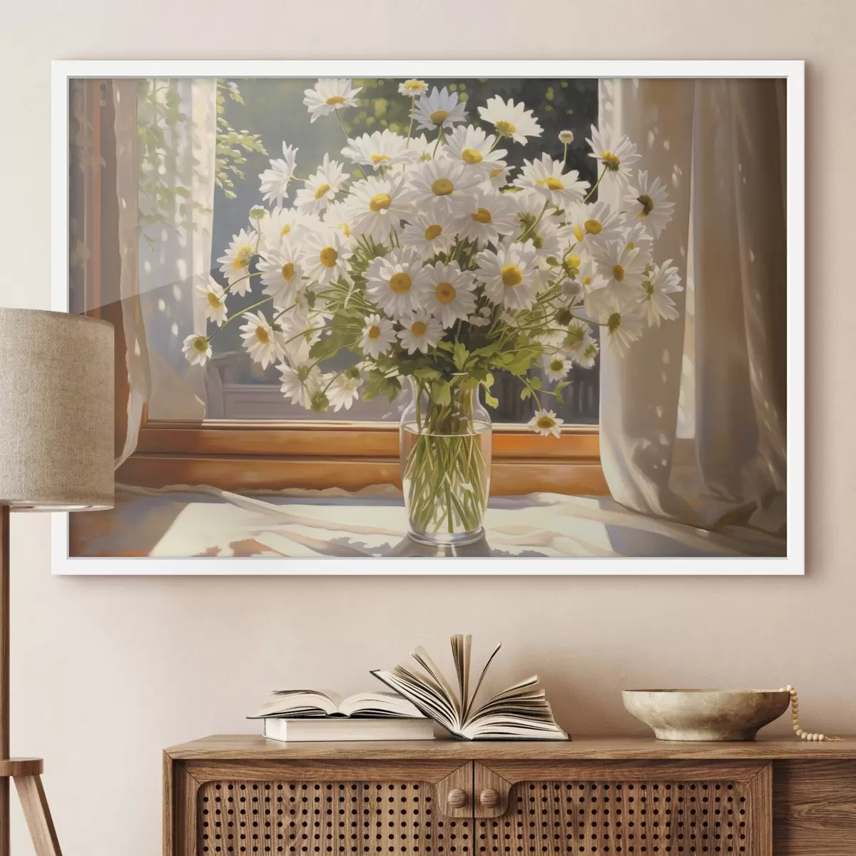 Poster Ölgemälde Nachahmung einer Vase mit weißen Gänseblümchen auf einer Fensterbank, sonniger Tag, warme Farben Palette Nr f43171
