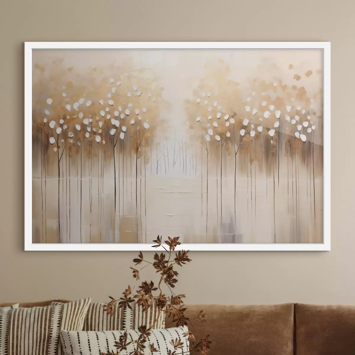 Poster Ölgemälde Nachahmung von braunen Bäumen mit weißen Blättern in einem Wald mit einem Fluss in der Mitte, weißer Hintergrund Nr f43172